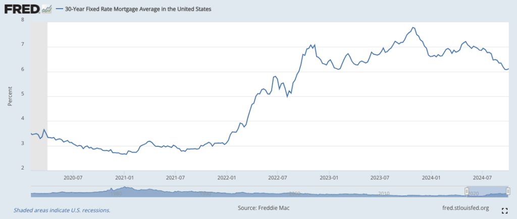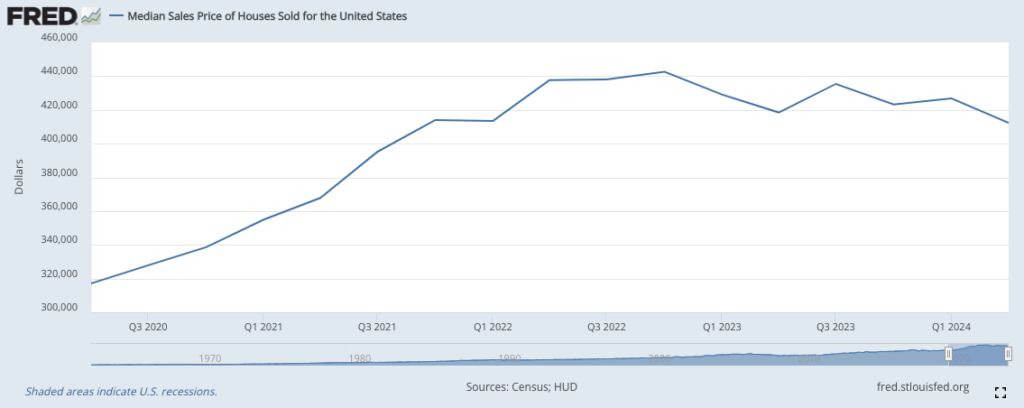 Data from the Federal Reserve Bank of St. Louis shows that incomes have been steadily increasing since 2020, while the median sale price of homes has either plateaued or declined slightly since peaking in early 2023. Additionally, mortgage rates have significantly decreased since their peak about a year ago. This combination of rising incomes, lower home prices and reduced mortgage rates means that housing is becoming more affordable for the average American.