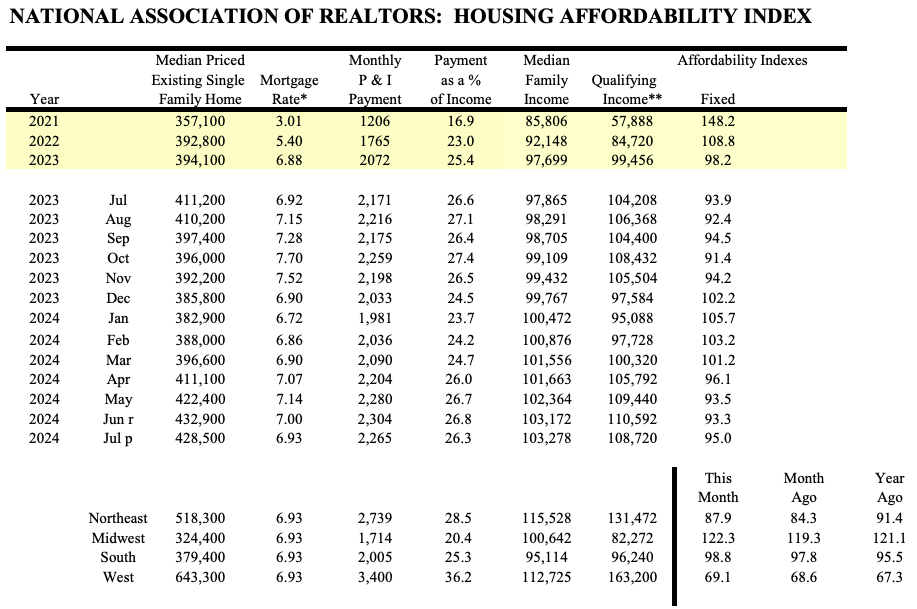 As shown below, the preliminary July index shows a slight bump up to 95.0 from a revised 93.3 in June. While housing is becoming slightly more affordable, the index indicates that the average household is not making enough money to qualify for an average house.