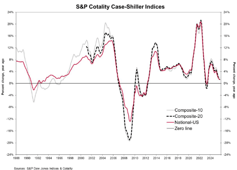 The S&P Case-Shiller Home Price Index reported a 1.4% annual increase in home prices for October 2025, up slightly from 1.3% in September. This is a modest year-over-year gain and is one of the weakest readings in recent years. Among the 20 markets tracked, eight posted year-over-year price declines.