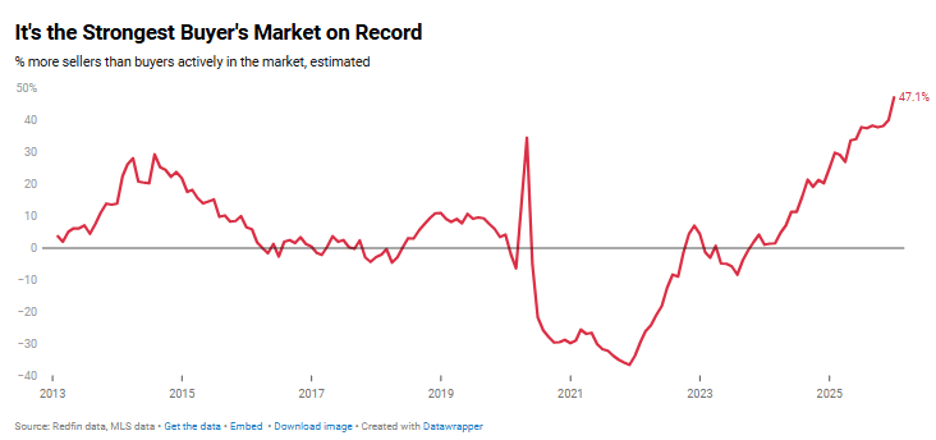 In December, there were 631,535 more sellers than buyers, the largest gap since Redfin began tracking in 2013 and firmly placing the housing market in a buyer's market. This gap widened by over 7 percentage points from November, the largest single month increase since 2022 and is up 22.2 percentage points year-over-year.