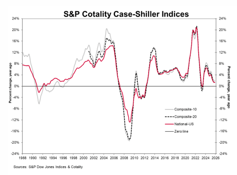The S&P Cotality Case-Shiller U.S. National Home Price NSA Index rose 1.4% annually in November, unchanged from the previous month. The increase in home prices is below the annual rate of inflation, meaning home prices declined year-over-year.