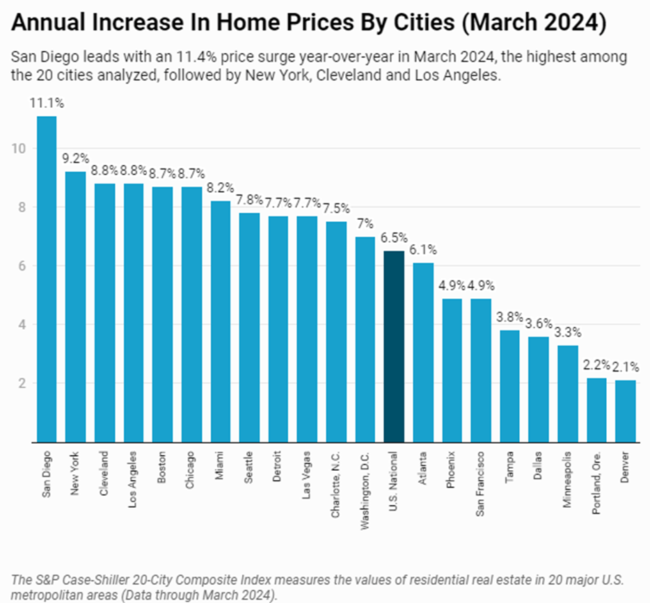 The Case-Shiller Home Price Index revealed that home prices hit another new high in March due to some easing in mortgage rates and the continued shortage in housing supply. Year-over-year, home prices rose 6.5% in the U.S., with San Diego seeing the largest metropolitan increase at 11.1%.