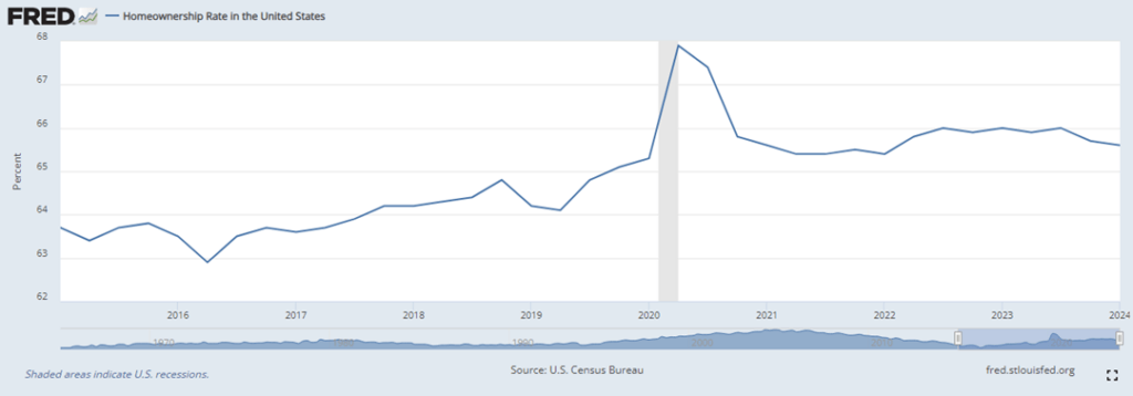 June marks the 22nd Annual National Homeownership Month, a time to raise awareness about and celebrate the benefits of owning a home. Recent data from the Federal Reserve Economic Data (FRED) indicates that homeownership for Q1 2024 sat at 65.6%. Although slightly down from the previous quarter, the general trend over the past decade shows a steady increase, reflecting the enduring desire for homeownership.