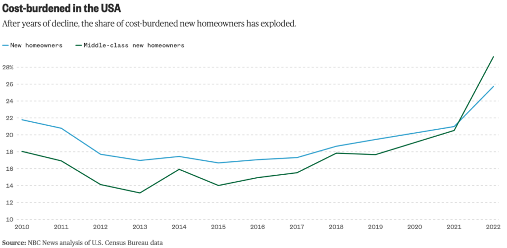 Home buyers across the United States are increasingly taking on higher mortgage payments in comparison to their income. The “cost-burdened” benchmark of those spending over 30% of their income on housing has doubled for the middle class over the past 10 years.