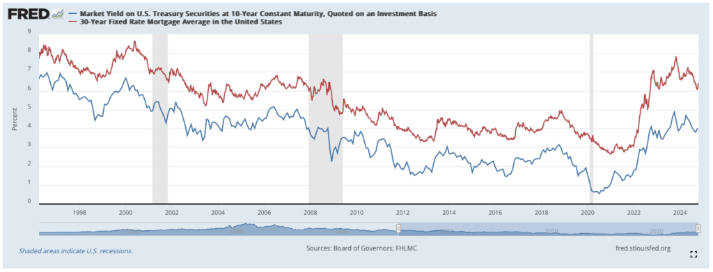 Here’s how it works: Treasury yields and mortgage rates tend to move together because they compete for the same low-risk investors. During the COVID-19 pandemic, when the Fed lowered the federal funds rate to virtually zero, yields on the 10-year Treasury plummeted to a historic low of 0.52%. As a result, mortgage rates also reached unprecedented lows. However, by 2022, as the Fed hiked rates to combat inflation, 10-year Treasury yields rose to nearly 3.5%, pushing mortgage rates over 5%.
